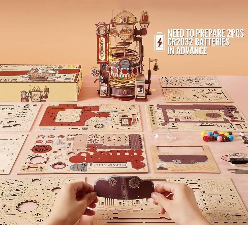 Dive into the fascinating world of steam-powered factory with our 3D model kit, complete with captivating LED signboards. Our wooden puzzle kits are made from non-toxic and recyclable materials. The mortise and tenon structure is more than just a model; it's an exciting journey through a candy production line.