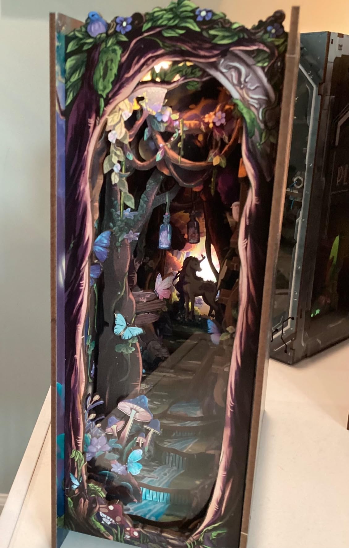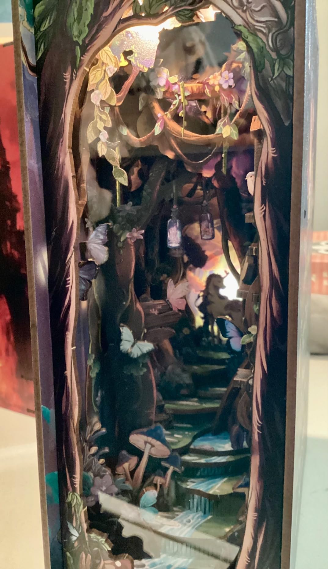 Adorned with mystical details like butterflies, mushrooms, and shimmering lights, it offers a delightful escape into a serene woodland world. A stunning addition to any bookshelf or home decor.