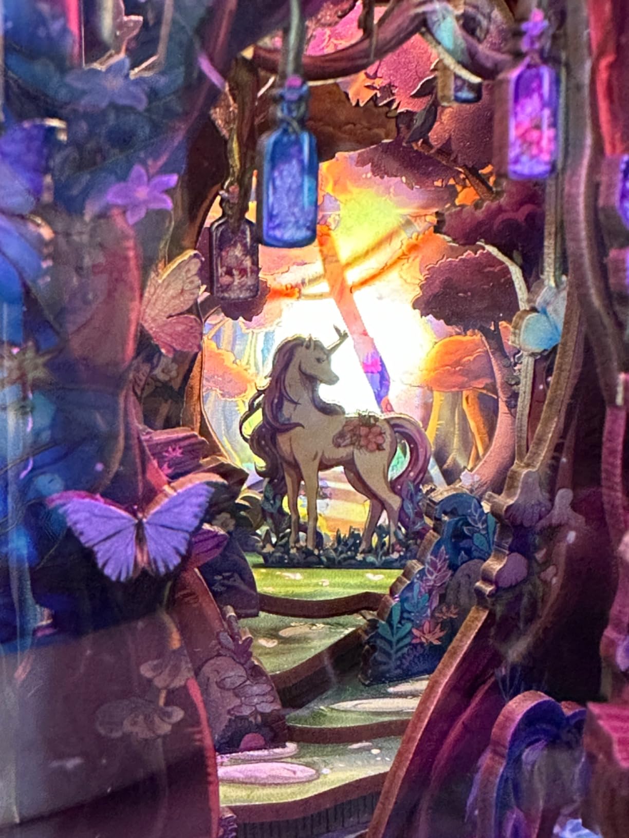 Featuring a magical forest scene complete with glowing lanterns, vibrant foliage, and an elegant unicorn, this intricate miniature brings fairytale charm to any space. Perfect for crafters and fantasy lovers alike.